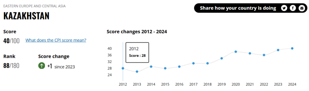 These efforts are paying off. According to Transparency International’s 2024 Corruption Perceptions Index (CPI), Kazakhstan ranked 88th out of 180 countries with 40 points out of 100—an improvement of one point and five places compared to the previous year. This is the country’s best result ever (28 points in 2012; 34 points in 2020).